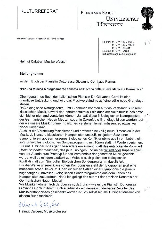 « Ed ora è avvenuto qualcosa di pressoché incredibile: la Musica e la Nuova Medicina Germanica ad un tratto si sono legate strettamente l'una all'altra, cosicché la Musica contiene le Cinque Leggi Biologiche della Natura! Accade pertanto che la Musica contiene cinque leggi biologiche naturali ferree. Una condizione, finora, pressoché inimmaginabile!